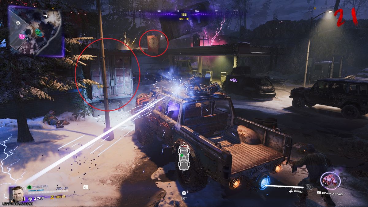 - If Tessie is destroyed, use your Aether Shroud to fix her as this will make the boss unable to see you. In the case that you don’t have an Aether Shroud, quickly run and put the truck between you and the boss or hide behind a pillar or ledge, as these will block the laser, and use your equipment to deal with the zombies while repairing Tessie.